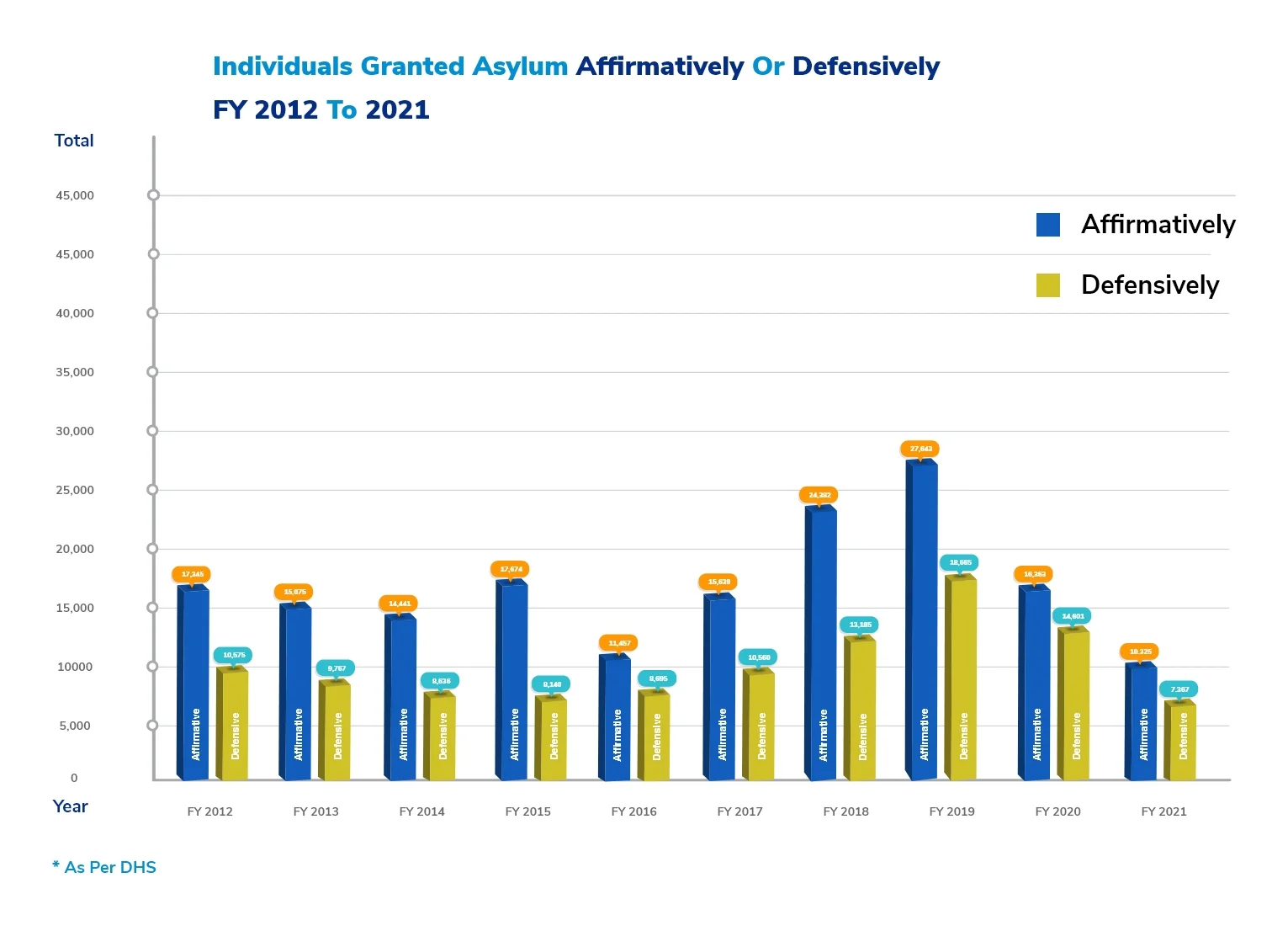 The table below shows the number of individuals granted Asylum Affirmatively or Defensively FY 2012 -2021.